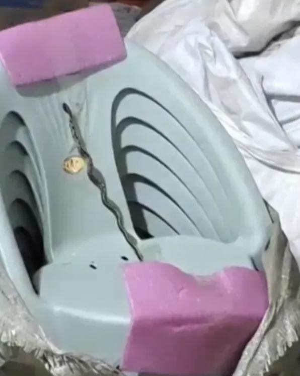“当时是我女儿和儿子一起拆的,他们打电话来跟我说里面有蛇,声音都是颤抖着的。那条蛇的头和尾被胶带固定住缠在了凳子上,一看就是人为的。我们也很后怕,不知道这条蛇是有毒还是无毒。”李女士说。